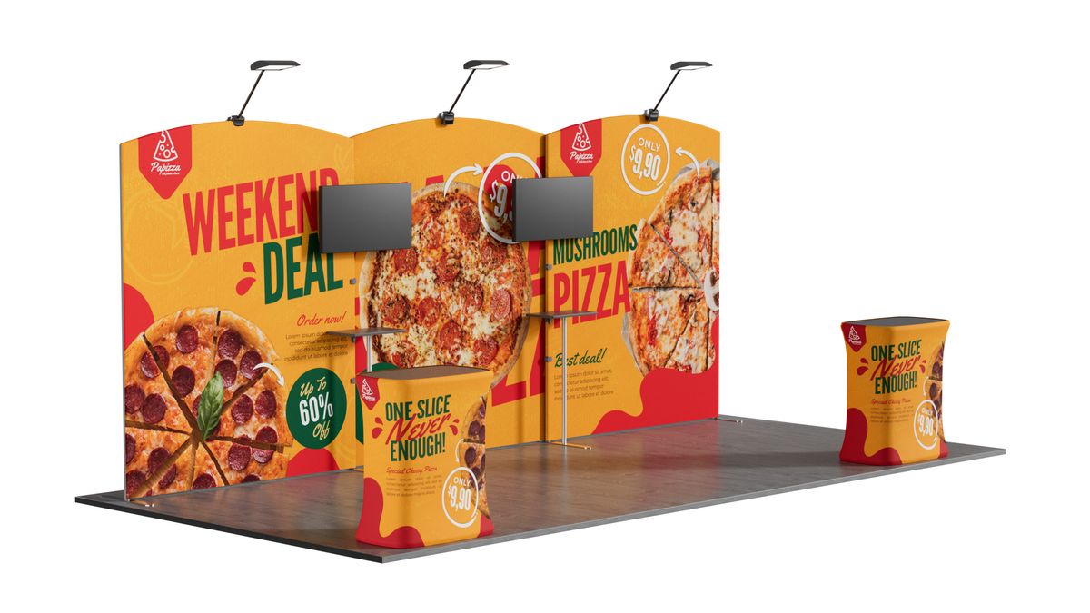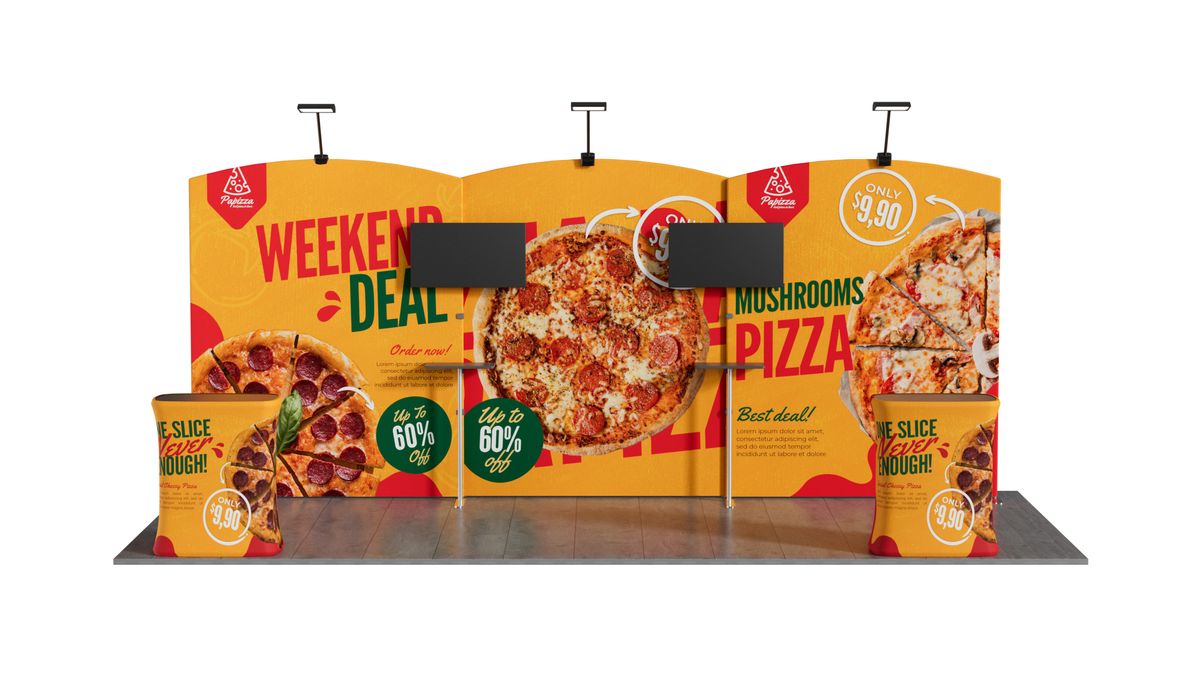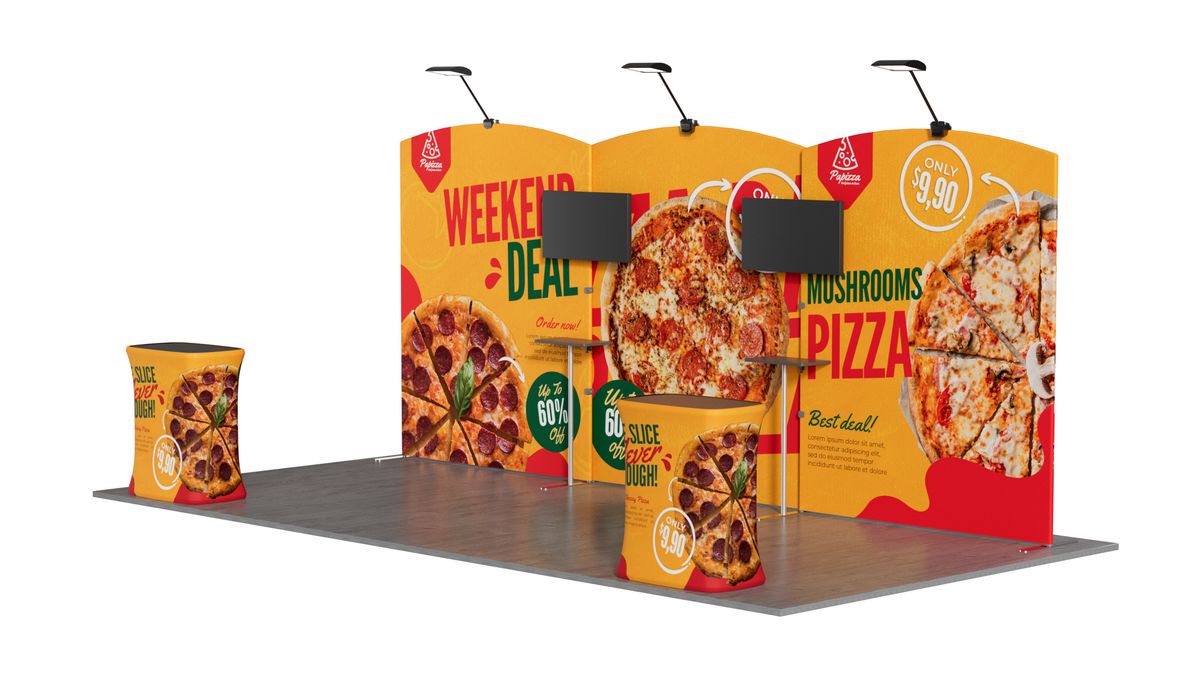 10ft x 20ft “P” Kit is a complete kit including three 6.5'w x 8'h arched rear center walls w/TV brackets, two modular tables, two 3'w x 3.3'h pop-up podiums and three LED Lights.