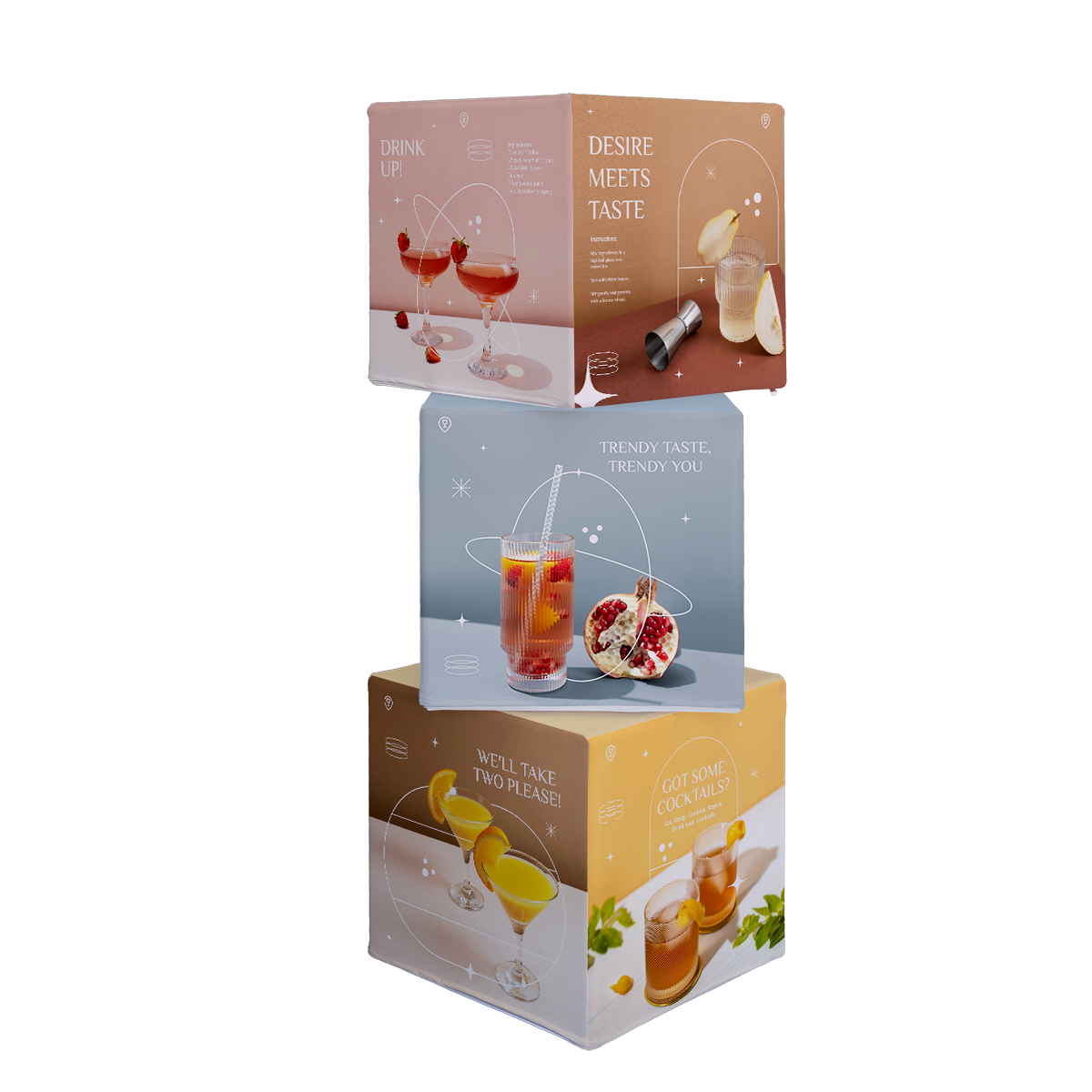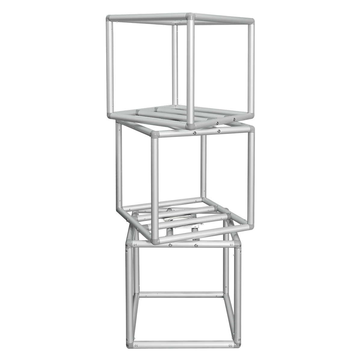 Three 20" Square Cubes that rotate with vibrant full color graphics on five sides. Simple no-tools set up and take down with free carry bag to hold all components. See for fabric only for replacement or alternative graphics.