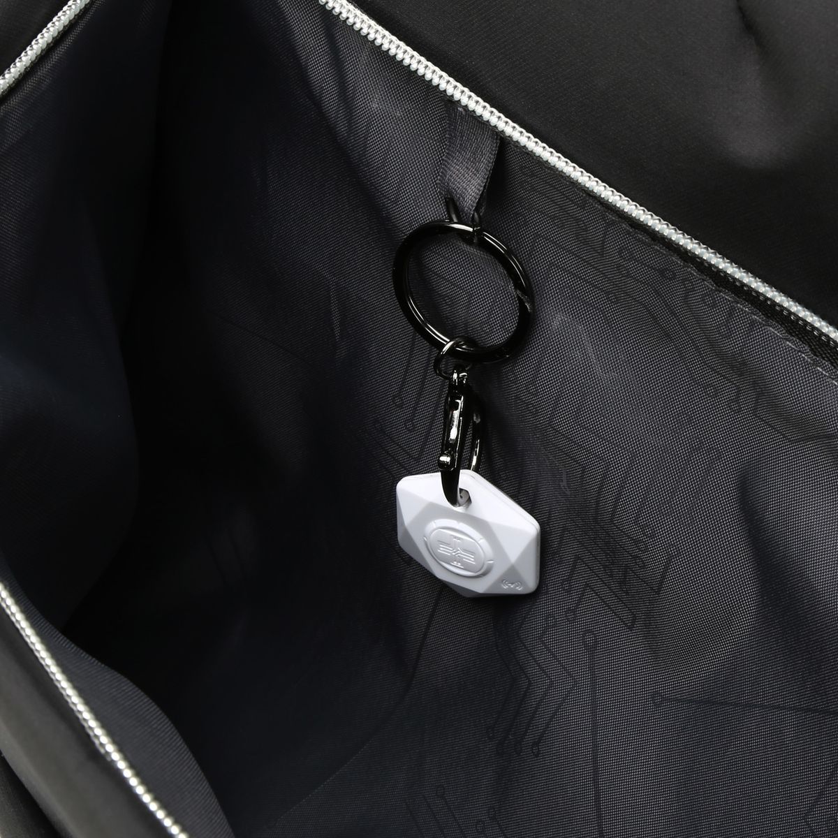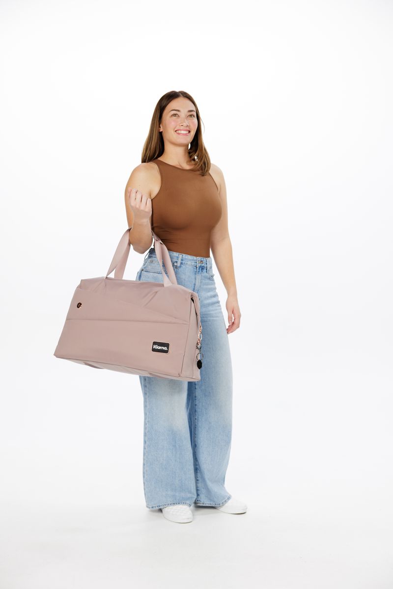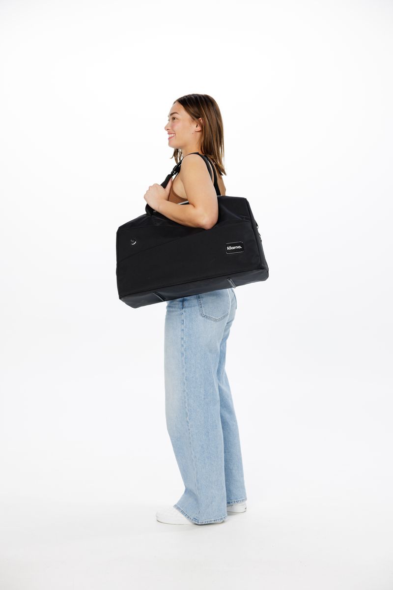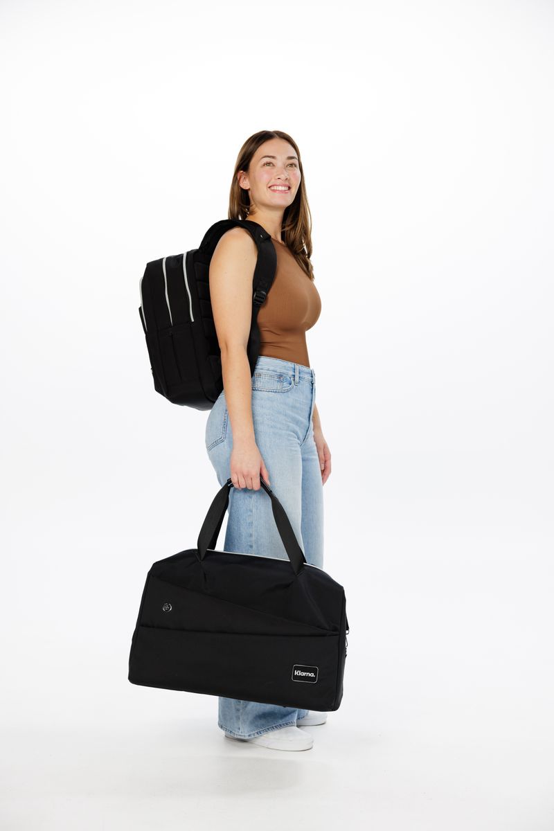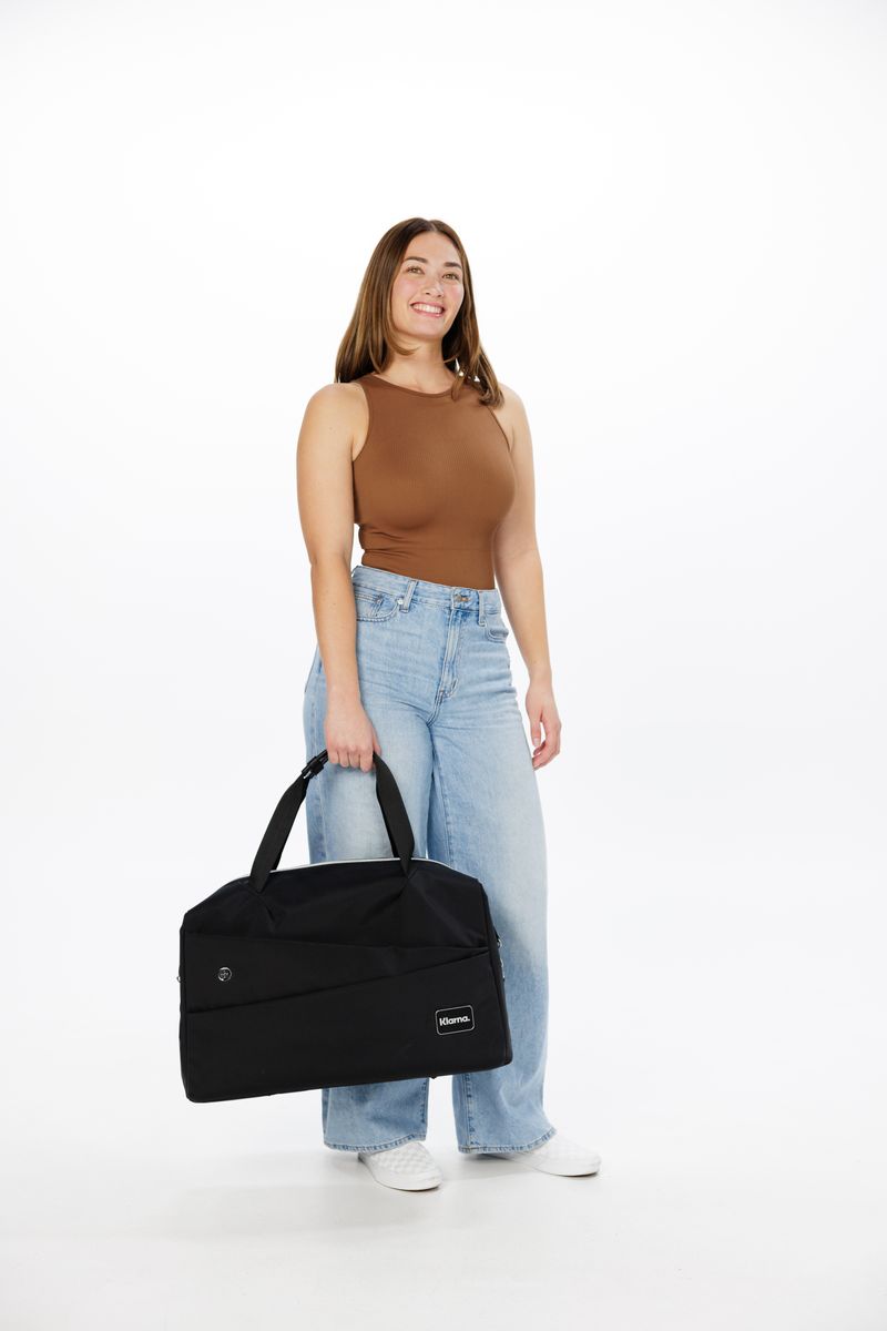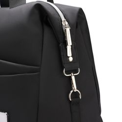 20.86" w x 14.96" h x 7.87" d, 40 Liters, made of recycled polyester, leatherette grab handles with magnetic button, large front pocket, hook and clip detachable zipper ends