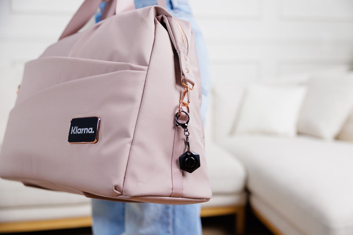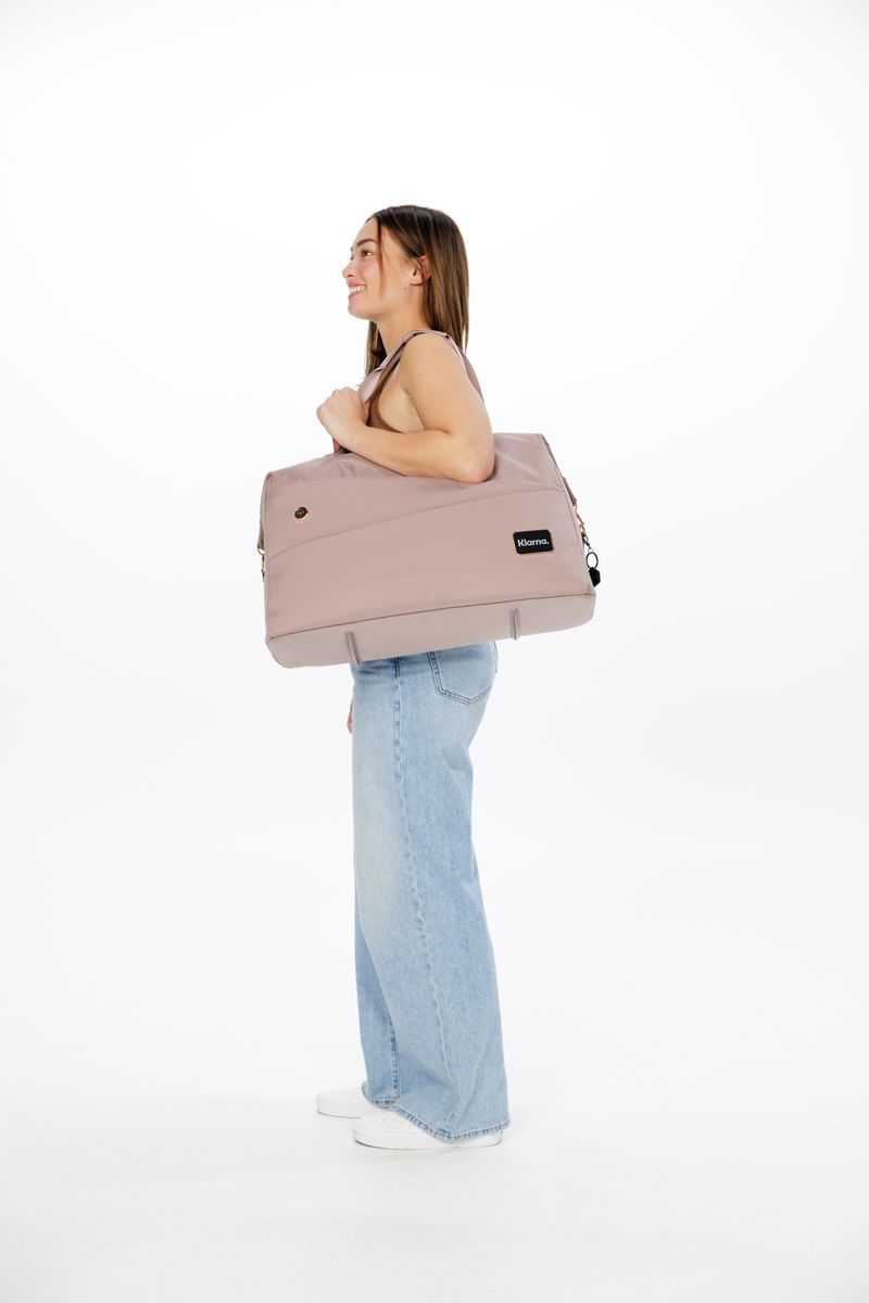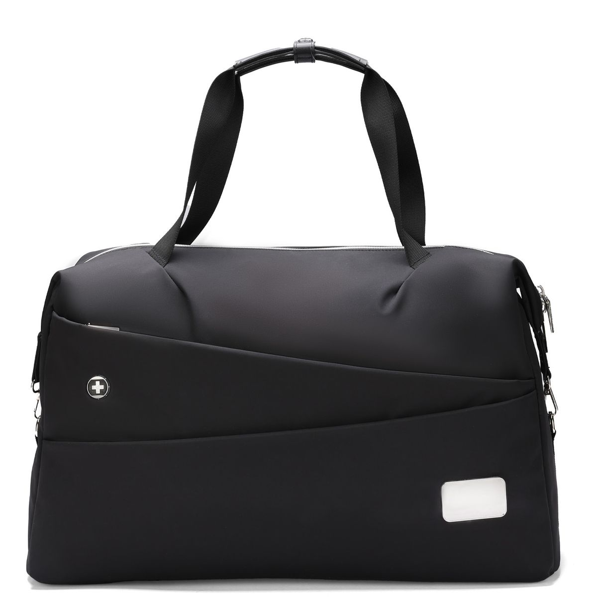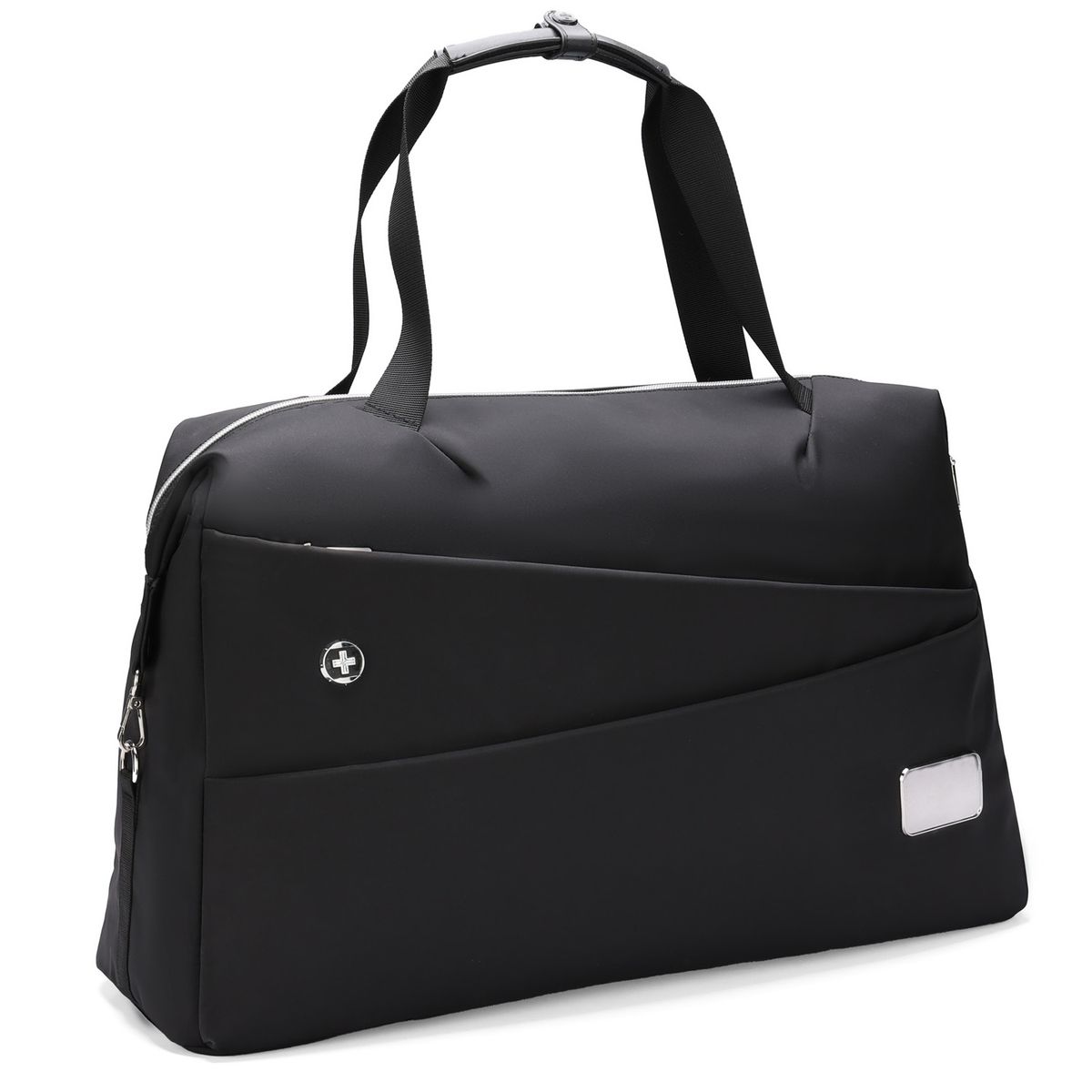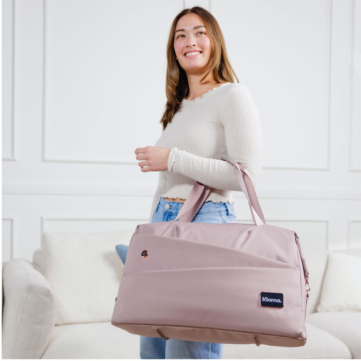 20.86" w x 14.96" h x 7.87" d, 40 Liters, made of recycled polyester, leatherette grab handles with magnetic button, large front pocket, hook and clip detachable zipper ends