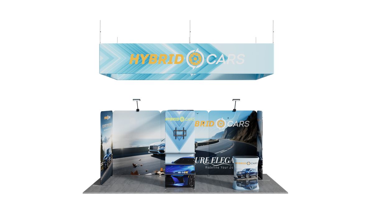 10ft x 20ft “H” Kit is a complete kit including one 18'long x 8'w x 3.3'h overhead hanging banner display, four 6'w x 8'h straight back & side wall displays, two 3'w x 8' h straight displays for arch w/shelves & TV bracket, one 2.6'w x 3.2'h x 1.6'd pop-up display and two LED lights.