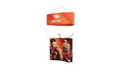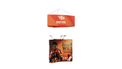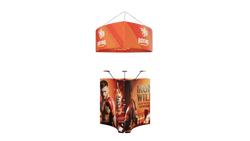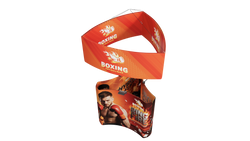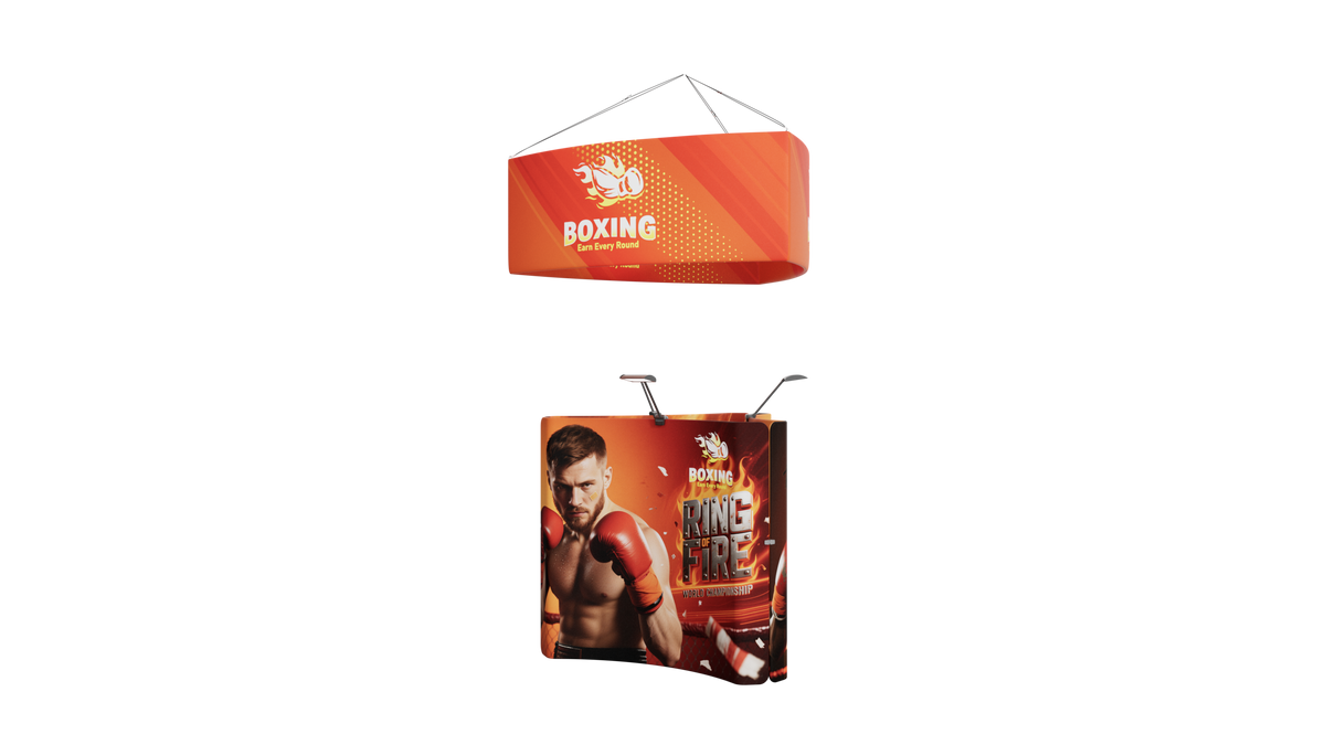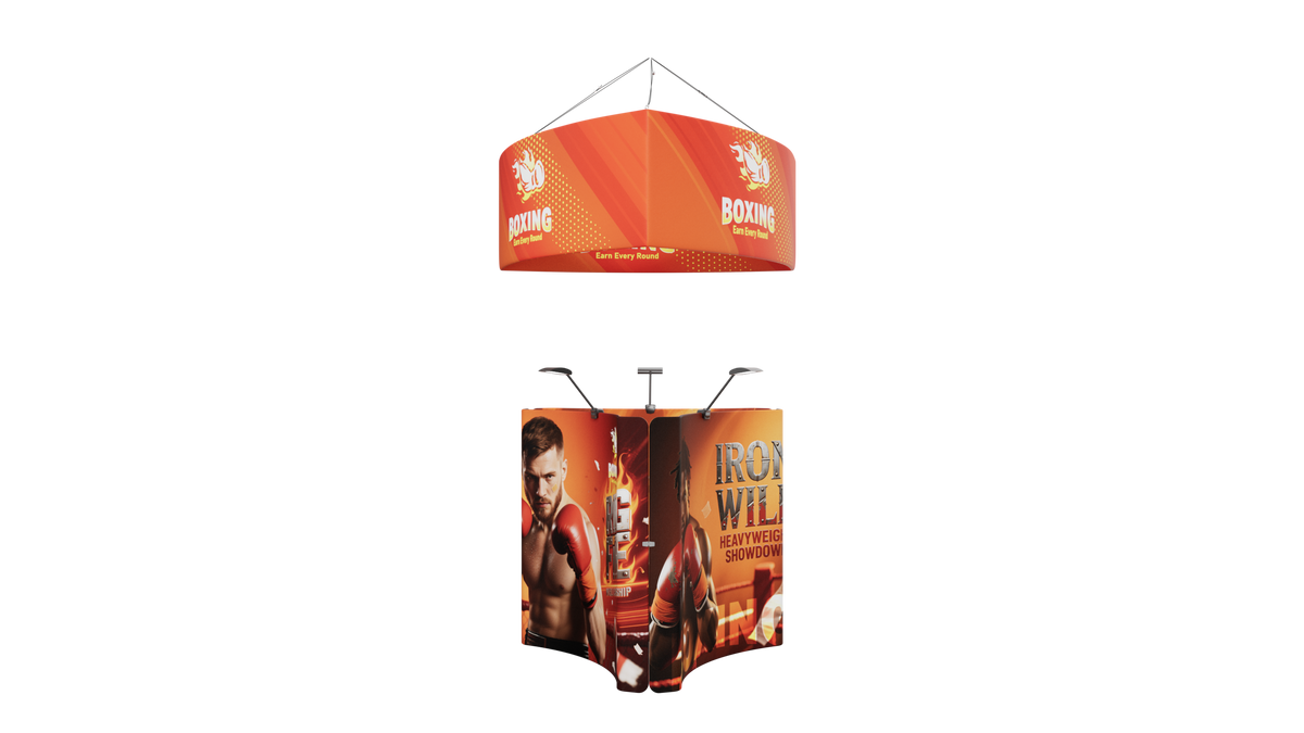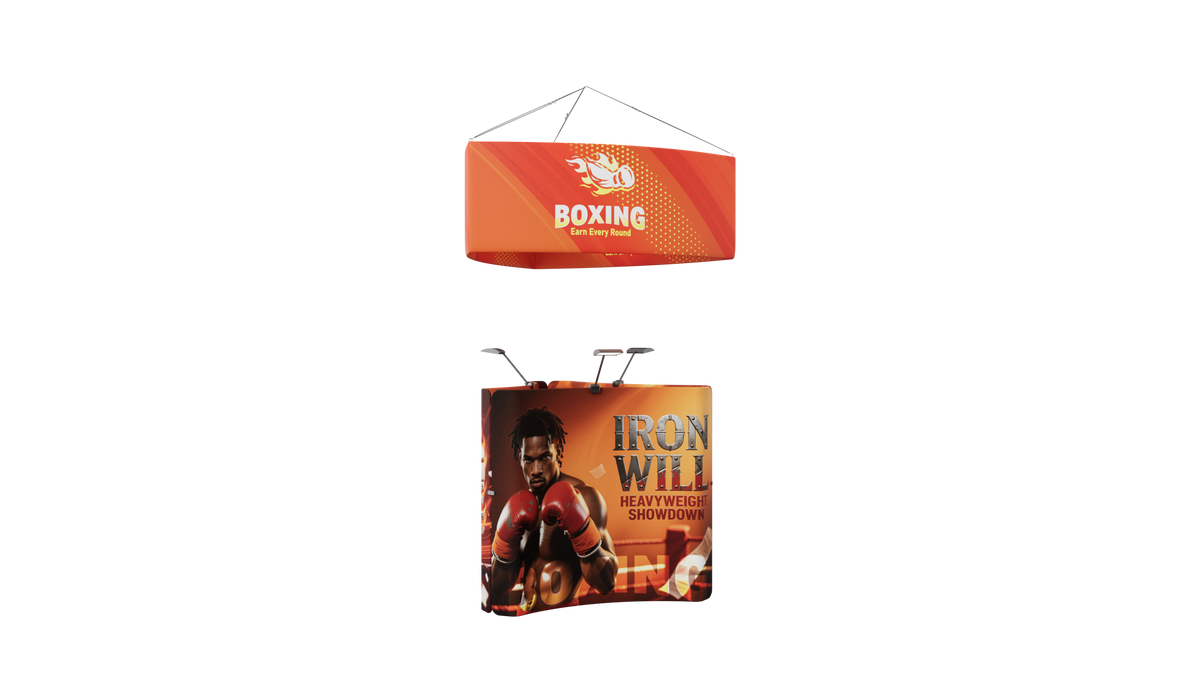10ft x 10ft “K” kit features 10'w x 3.3'h curved triangle hanging display w/strong wires and hooks, three 10'w x 7.5'h curved walls to form a triangle shape display and three LED lights.